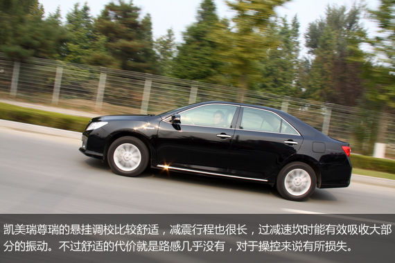 凯美瑞尊瑞采用了前麦弗逊式独立悬挂,后支柱连杆式独立悬挂,这种后悬挂其实是麦弗逊变形来的,整体特性没有多连杆出色。不过悬挂都得看调校,保时捷Boxter的后悬挂其实也是这种结构,但调校非常出色。凯美瑞尊瑞的悬挂则调校很软,主要还是偏向舒适性。