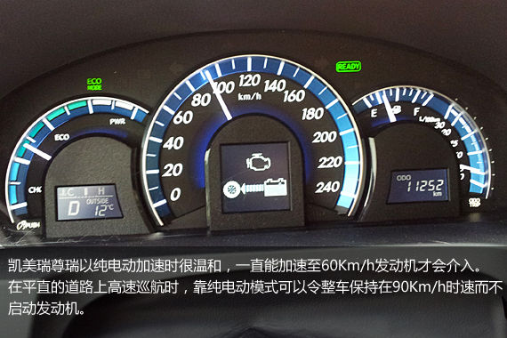 开着凯美瑞尊瑞感觉就像开地铁,尤其是起步的时候你会听见电机逐步提升转速的那种嗡嗡声,很有乐趣。依靠电机起步对于凯美瑞尊瑞来说略微有点费力,有时会落下别的车一个车身左右。但这种异常平稳线性的起步,可以一直将车速加速到60Km/h,而且平顺性是任何传统变速箱所比不了的。
