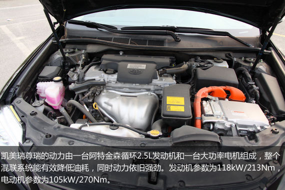 凯美瑞尊瑞配备了最新研发的混合动力阿特金森循环2.5L 4AR-FXE发动机和新一代混合动力系统,阿特金森循环的高压缩比发动机(12.5)最大扭矩达到213Nm,最大输出功率达到118kW。电动机的最大输出功率为105kW,最大扭矩为270Nm,系统整体的最高输出功率为151kW。