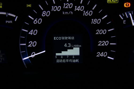 尊瑞仪表盘左侧的电机工作状态表是最好玩的地方,开这个车的人难免会被它吸引。尽量保持在纯电动模式下行驶,能为你省下更多的燃油。不过有一点我不太满意,就是中央的液晶屏需要切换到混动工作状态时才会看到电池电量,如果能在仪表盘上单独开辟一块地方专门显示电池电量会更方便。