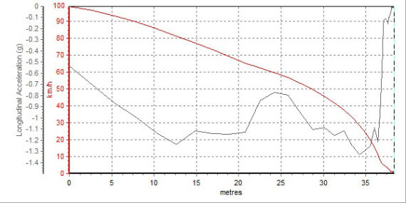 在100-0km/h制动测试中,艾瑞泽7得到了40.31m的成绩,距离40m大关非常的接近,综合试驾车的车况以及轮胎的磨损情况,艾瑞泽7能够得到这个成绩,可以说是一个不错的成绩。但由于艾瑞泽7的悬挂调校更倾向于舒适性,整体偏软,因此在紧急制动测试的时候车身姿态并不是特别的优雅,前倾的姿态非常的明显,但仍然被控制在可以接受的范围之内。